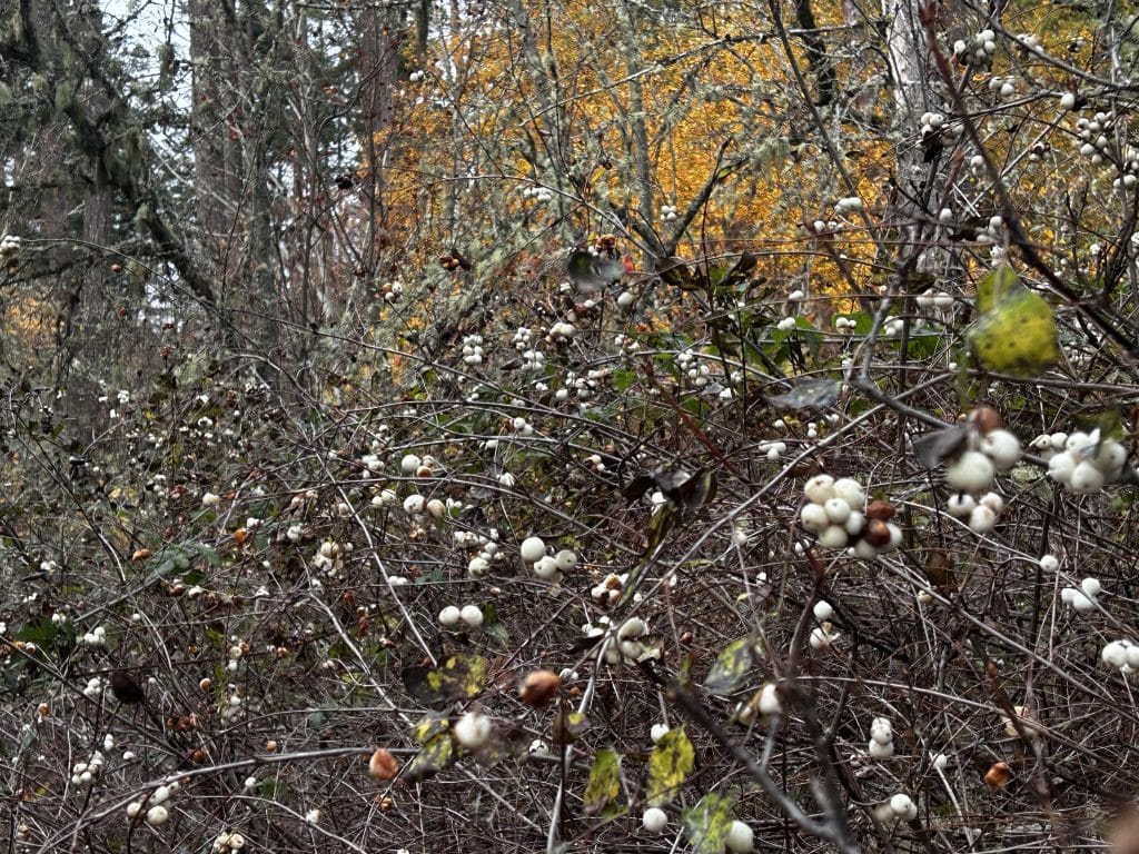 Now that most of the deciduous trees and bushes have lost their leaves, festive displays of native white snowberries (PEPKIYOS, Symphocarpus albus, also called waxberries)1 have become evident. Snowberry bushes are common in Douglas fir and Garry oak ecosystems around here, appearing in thickets along trails, open areas, ditches, and streambanks.