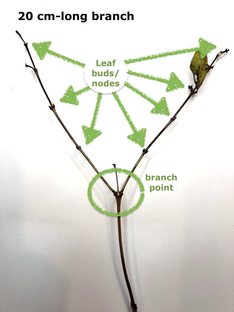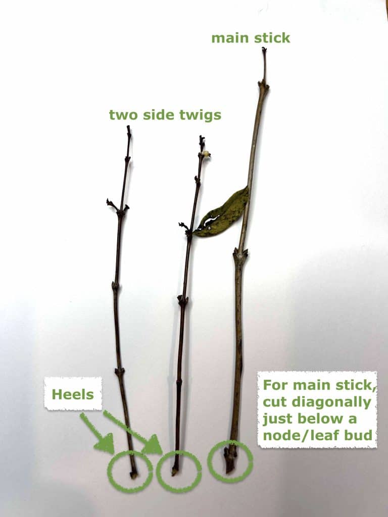 With clean sheers, cut one 25-cm branch that has numerous small twig-like branches – each one of these twigs will become one bush. Slowly tear the two twigs off the main branch manually so that, as in this example, you will have three sticks, each with many dormant leaf buds (also called nodes). The ends of the twigs are called heels and are a great surface from which roots will grow. The main stick can also be propagated by making a diagonal cut just below a leaf bud, which contains the necessary stem cells to produce roots. While not necessary, dipping the twigs or stick ends in a commercial rooting hormone may increase the chances of success. You can buy this rooting hormone at a garden store or nursery.